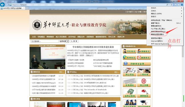 考试用机电脑配置要求:操作系统:ws XP win7 win8 使用IE浏览器8及以上版本,推荐IE9,不推荐使用其它浏览器。浏览器请使用兼容模式上网。兼容模式设置如下图操作所示: