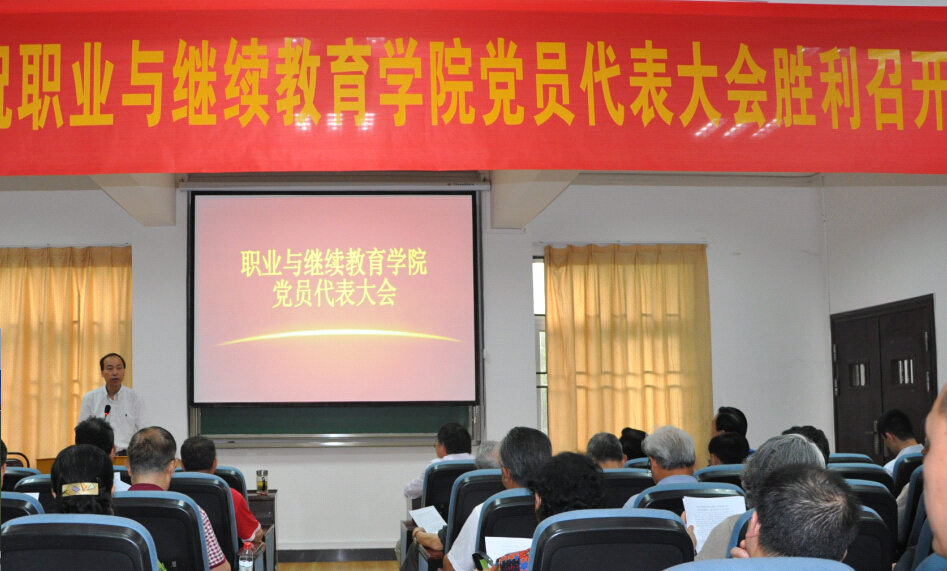 2015年5月28日在南湖104报告厅召开职业与继续教育学院党员代表大会,会议由卢子洲院长主持。大会共完成六项会议议程。