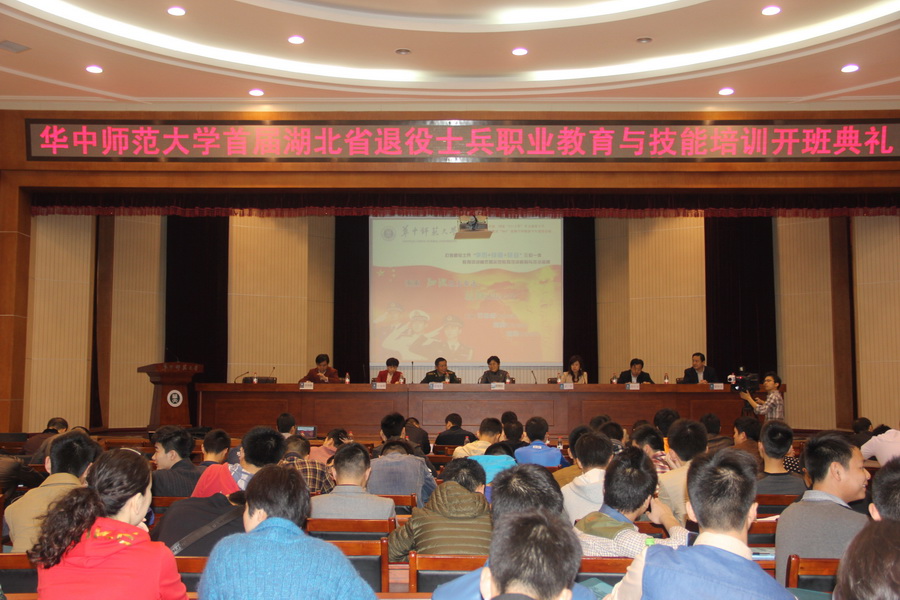 3月28日上午,首届湖北省退役士兵职业教育与技能培训班开班典礼在我校科学会堂报告厅顺利召开。华中师范大学副书记黄晓玫、湖北省军区动员处主任余廷胜、湖北省人力资源和社会保障厅职业鉴定中心副主任叶旭辉、武昌区民政局局长孔屏、华中师范大学职业与继续教育学院书记陈传忠等出席,职教院副院长吴绍靖主持了典礼。