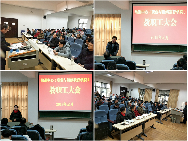 2019年1月16日下午,培训中心(职业与继续教育学院)在104报告厅召开全体教职工大会。会上通报了学校关于新任领导班子成员的调整决定,并对假期工作安排进行部署。会议由中心党委书记廖水明主持。