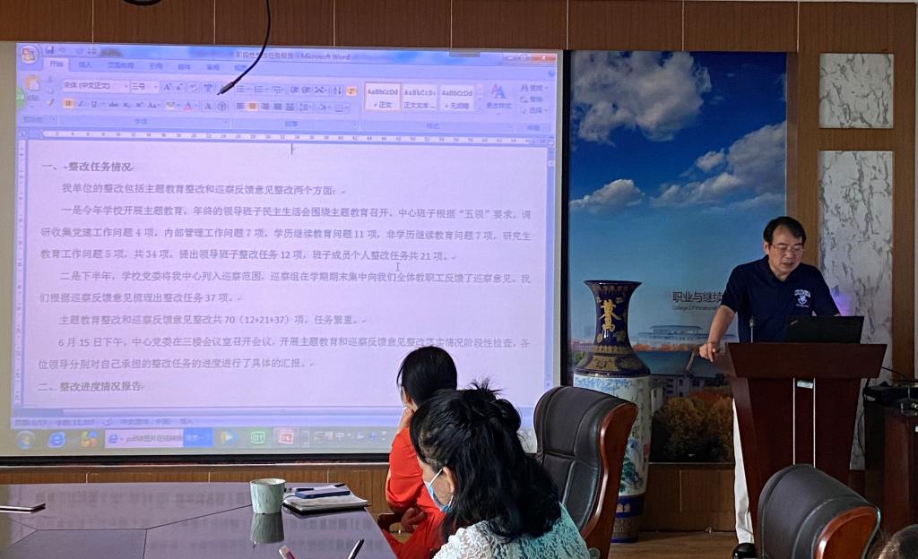 廖水明首先作了《培训中心关于主题教育和巡察反馈问题整改阶段性任务完成进度情况》的报告。他用了1个小时的时间逐项介绍了培训中心整改任务情况以及当前进度情况,其中主题教育领导班子整改任务12项,班子成员个人整改任务21项,巡察反馈意见整改任务37项,共70项任务,截至目前已完成45项,占比64.3%;正在进行或基本完成24项,占比34.3%;未启动1项,占比1.4%。进度情况表明分党委未受疫情影响,积极抓整改,进展顺利。他特别说明,中心(学院)党委召开此次会议,目的是再一次动员大家积极参与和支持整改工作,听取意见进行开门整改,力求解决实际问题,力求见实效、见真章,向教职工交出满意答卷。
