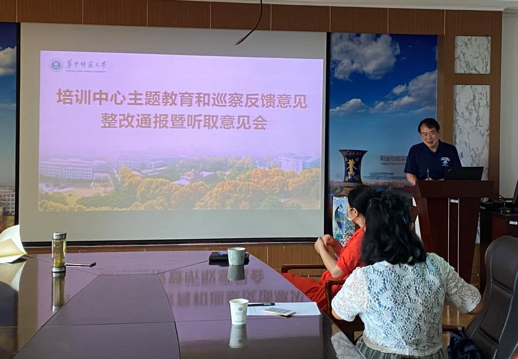 7月1日上午,培训中心(职教院)党委在南湖办公楼三楼会议室召开主题教育和巡察反馈意见整改阶段性工作情况通报暨听取意见会。中心(学院)党委书记廖水明、副处级组织员李秋萍、各部门主任、各工会小组长、民主党派人士代表、党员和群众代表共18人参加会议。会议由廖水明书记主持。