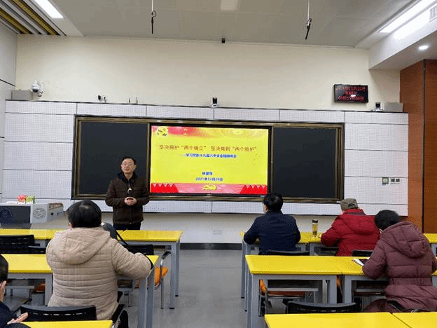 (通讯员:徐玲)12月29日,培训中心在南湖综合楼N210教室组织全体教职工学习党的十九届六中全会精神。中心党委书记林更茂作了题为《坚决拥护“两个确立” 坚决做到“两个维护”》的辅导报告。