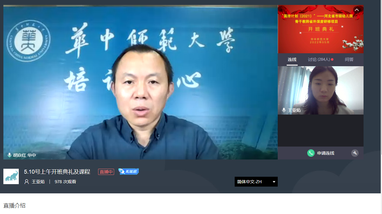 (通讯员 杨晓丽)2022年5月10日上午8点30分,华中师范大学承办的 “国培计划(2021)”河北省市级幼儿园骨干教师省外深度研修项目(线上)顺利开班。