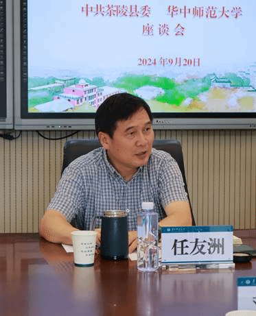 任友洲副校长在座谈会上致辞。他对茶陵县委县政府的领导表示热烈欢迎,并简要介绍了学校的历史、办学理念和近年的发展成就,强调学校正积极推进“双一流”建设,致力于成为教师教育领先的世界一流大学。