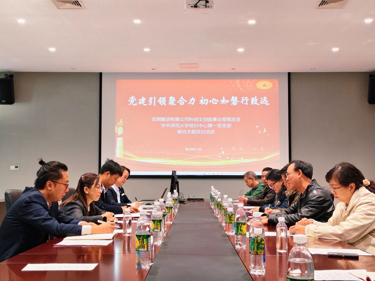 (通讯员 牛文超)11月26日下午,华中师范大学培训中心(职业与继续教育学院)第一党支部赴武汉钢铁(集团)公司,与武钢集团有限公司科创文创园事业部党总支开展联合主题党日活动。武钢集团有限公司科创文创园事业部党总支书记、副总经理卢滢,副总经理刘瑞宇;培训中心(职业与继续教育学院)党委书记林更茂,副主任(副院长)潘珞琳,第一党支部书记、副主任(副院长)李娜出席座谈会,双方党员代表参加交流学习。此次活动通过现场参观、专题领学、支部共建、研讨交流等多种形式,进一步探索新时代高校党建与企业党建的互融互促。