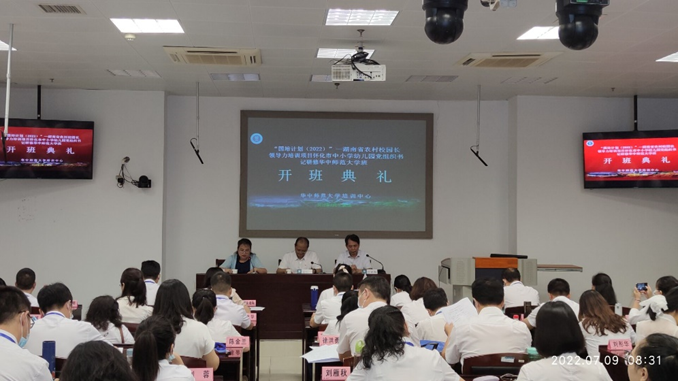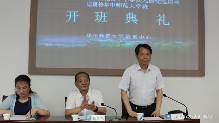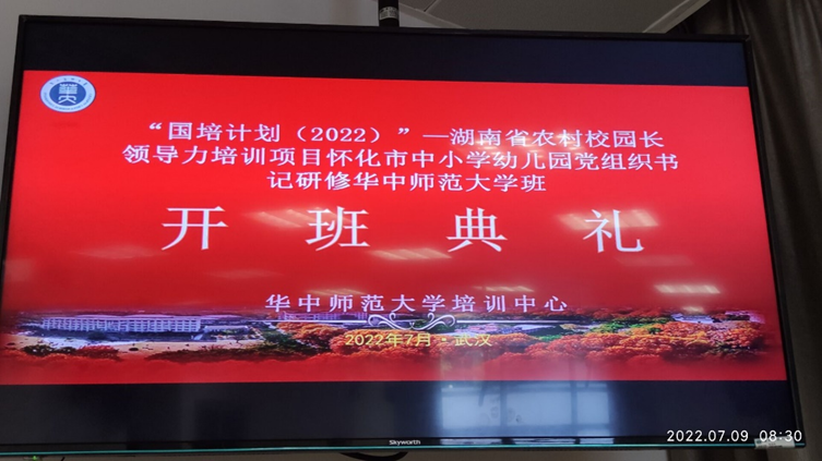 2022年7月8日上午8点30分,华中师范大学承办的“国培计划(2022)”湖南省农村校园长领导力培训项目怀化市中小学幼儿园党组织书记研修培训班在管理教育综合楼顺利开班。