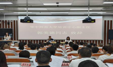 华中师范大学培训中心(职业与继续教育学院)副主任郭美德出席开班典礼并致辞。他向参加此次研修活动的骨干教师们表示热烈欢迎。接着,他向学员们简要介绍了此次“国培计划”实施的概况,重点阐述了此次国培计划实施的意义。他希望这期培训班能成为先进理念的讲坛、教学经验交流的窗口、前沿问题切磋的平台。最后,他预祝学员们学有所成,圆满完成本次培训任务。