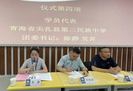 青海省尖扎县第二民族中学团委书记陈静老师作为教师代表发言。陈老师首先表达了对本次学习的期待与向往,并代表全体学员承诺,将严格遵守纪律,认真参与培训,主动学习,深入思考,力求在“研”中有所收获,在“修”中有所成就。她表示将深入反思此次学习,将所思所获转化为实际成果,为党育人、为国育才,共同绘制立德树人的同心圆。