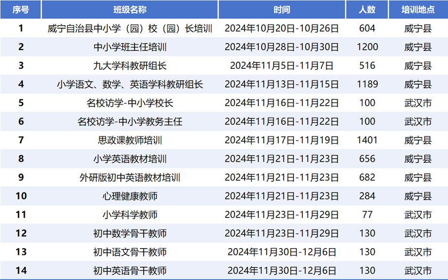华中师范大学培训中心与威宁县教育局协同管理,积极筹备和引导学员参训,经过近50天的精心组织,培训人次已达到7000余人,培训对象涵盖了中小学校(园)长、教导主任、中小学班主任、初中语数英政史地物化生学科教研组长及骨干教师、小学语数英学科教研组长及骨干教师、思政课教师、心理健康教师等多类教育对象。具体实施情况如下图: