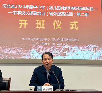 首先,汪昌海副主任发表了热情洋溢的欢迎辞。他向在座的各位校长表达了诚挚的欢迎之情,并深情回顾了华中师范大学悠久的办学历史和深厚的文化底蕴。在致辞中,他深刻剖析了河北省教育厅组织此次培训活动的深远意义与重要价值,解读和评价了华中师范大学培训中心为此次培训精心设计的课程体系和丰富多样的学习安排。他衷心希望各位校长在华中师范大学的学习生活能够愉快顺利,在专业培训中深入钻研,做到学有所悟、学有所成、学有所用,实现教学管理能力与综合素质的双重提升。同时,他也强调了培训纪律的重要性,鼓励大家全情投入,珍惜这段宝贵的学习时光,力求收获满满,留下一段充实而难忘的记忆。