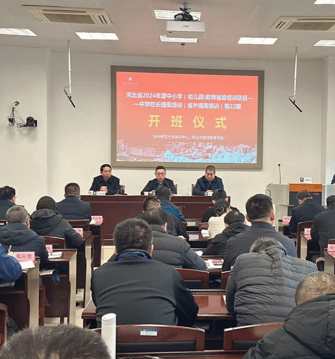 2024年12 月 19 日上午,河北省2024年度中小学(幼儿园)教师省级培训项目中学校长提高培训(省外提高培训)第3期开班典礼在华中师范大学举行。华中师范大学培训中心专职组织员汪昌海、河北省省委教育工委党校(河北省教育干部学院)校长任学印、河北省省委教育工委党校(河北省教育干部学院)培训部主任李向军出席开班典礼,培训班62名校长参加了此次开班典礼。