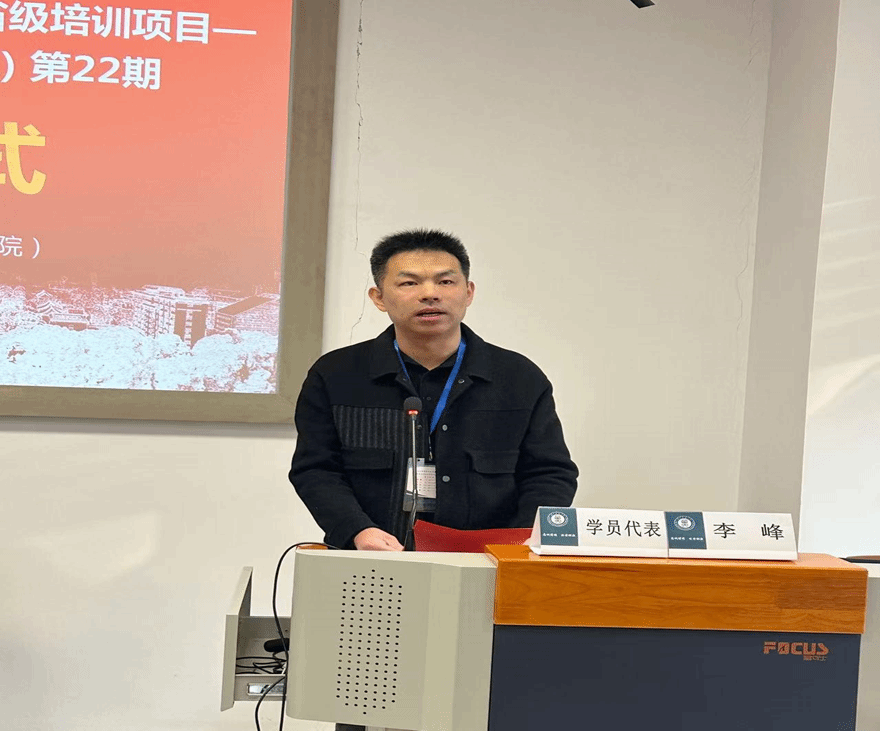 邯郸市第四中学的李峰校长代表全体学员发言。李峰校长表示,作为学员,我们要认真聆听专家们高屋建瓴的讲座,汲取前沿的教育理念和管理智慧;要与来自各地的优秀校长们深入交流,分享彼此在学校管理中的成功经验与困惑难题,碰撞出思维的火花;要通过案例分析、实地考察等丰富多样的学习形式,拓宽视野,提升解决实际问题的能力,为回到学校后的改革发展积蓄力量。李峰校长的发言,引起在场学员的情感共鸣,会场响起了热烈的掌声。