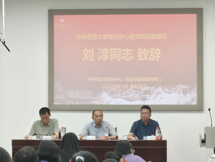 华中师范大学培训中心教师培训部部长刘淳发表热情洋溢的致辞。他对全体学员的到来表示热烈欢迎,并简要回顾了华中师范大学百余年的办学历史及学校在教师教育等领域获得的成绩。刘淳部长表示,中心将充分整合校内外优质教学资源,组建高水平专家团队,围绕新时代教师核心素养,精心设计培训课程,优化服务保障,全力以赴把本期培训办成高水平、有温度、见实效的品牌项目,助力学员专业成长。