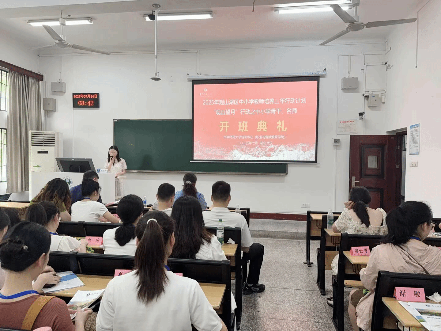 (通讯员:田姗 吴运生 杨玲 张敏)为深化教育教学改革,全面提升区域教师队伍的专业素养与育人能力,2025年7月14日上午,由贵州省贵阳市观山湖区教育局主办、华中师范大学培训中心承办的“2025年观山湖区中小学教师培养三年行动计划‘观山望月’行动之中小学骨干教师、名教师培训”开班仪式在华中师范大学举行。华中师范大学培训中心副主任潘珞琳出席开班典礼并致辞,观山湖区各中小学的100位骨干教师、名教师参加,开启为期6天的沉浸式研修之旅。