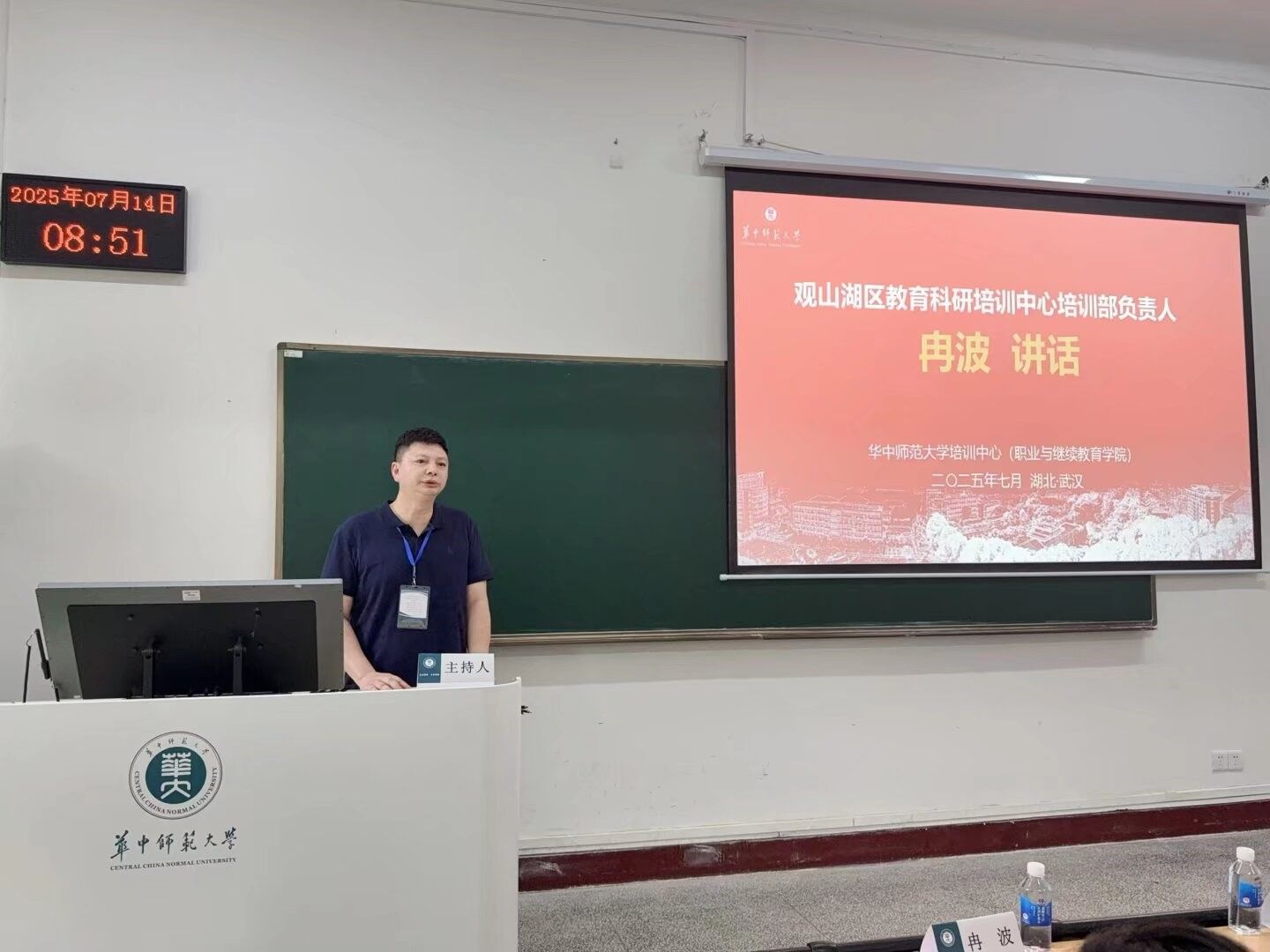 观山湖区教育科研培训中心培训部负责人冉波致辞,对华中师范大学培训中心的精心筹备和周到安排表示衷心感谢。他指出,本次研修旨在落实立德树人根本任务,顺应新时代教师队伍建设要求,全面提升骨干教师核心竞争力。冉波介绍了学员遴选过程、培训目标及对学员的期望,并提出三点要求:一是迅速转换角色,潜心研修;二是勤于思考,学以致用;三是严守纪律,确保安全。区教培中心将持续关注学员学习动态,全力做好支持保障工作。