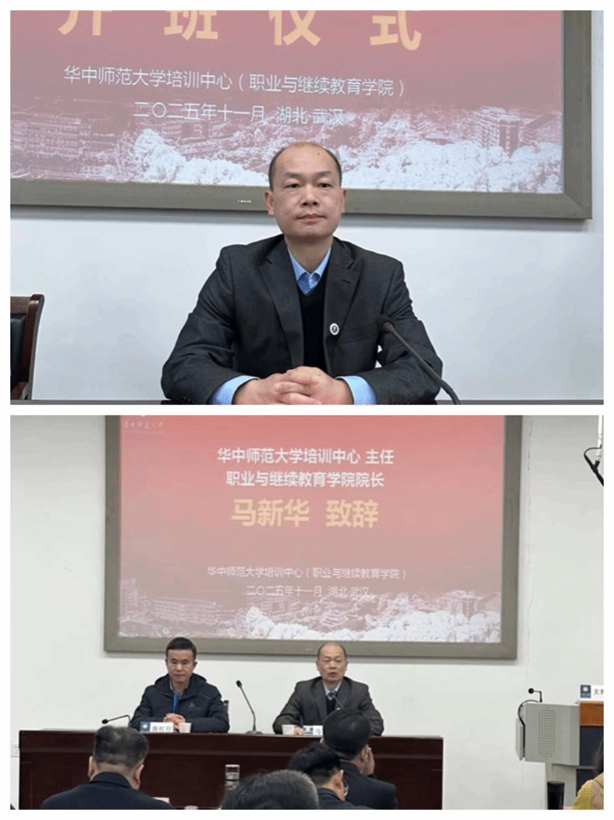 开班仪式在庄严的国歌声中启幕。冬韵渐浓,学思正盛。华中师范大学培训中心主任马新华出席仪式并致欢迎辞。他首先代表学校对远道而来的河北省64位省级示范性高中校长、书记表示热烈欢迎,并对河北省教育厅的信任与支持致以诚挚谢意。马新华主任深情回顾了华中师范大学百廿余载的办学历程,阐述了“忠诚博雅、朴实刚毅”的华师精神,并介绍了学校在教师教育领域的卓越成就,教育学在第五轮学科评估中荣膺A+,拥有3个国家“双一流”建设学科等。