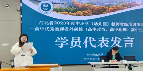 来自河北省唐县第一中学的马芳老师代表培训学员发言,马老师感谢河北省教育厅和华中师范大学培训管理团队的精心组织和安排,她表示这是一次难得的培训机会,老师们将以饱满的热情投入到学习中,不断提升自己的教育教学水平,为培养更多优秀的人才贡献力量。马芳老师代表全体学员表态,在接下来的培训中将认真学习,遵守培训纪律,积极交流,共同进步。