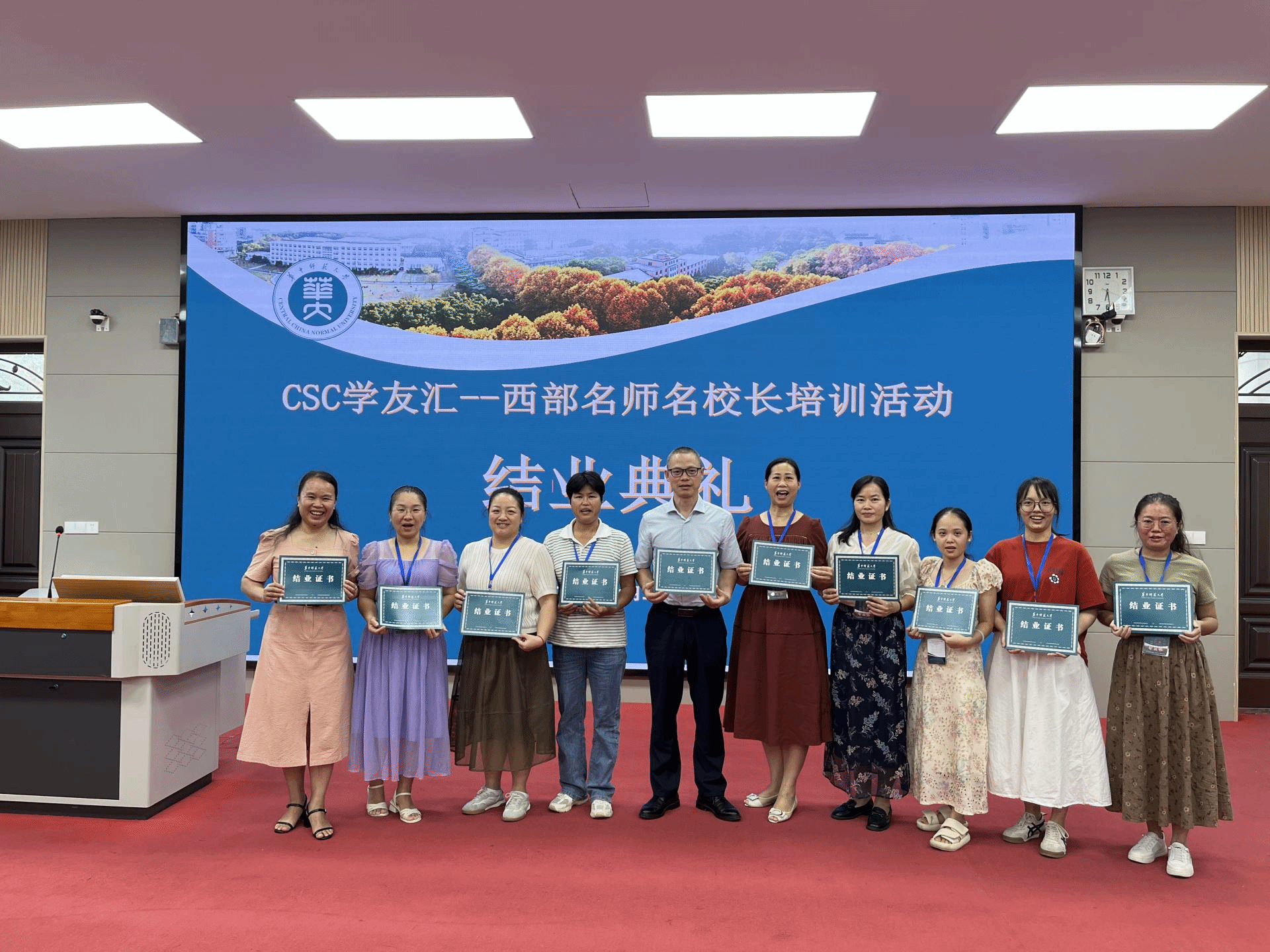 2024年7月25日下午,由国家留学基金管理委员会主办、华中师范大学培训中心承办的“CSC学友汇-西部名师名校长培训活动”在华中师范大学圆满落下帷幕。国家留学基金管理委员会法律与综合事务部项目主管梅仕士、华中师范大学培训中心副主任吴海涛,以及来自广西壮族自治区崇左市天等县和来宾市忻城县的82位名师、名校长齐聚一堂,共同见证这一难忘时刻。