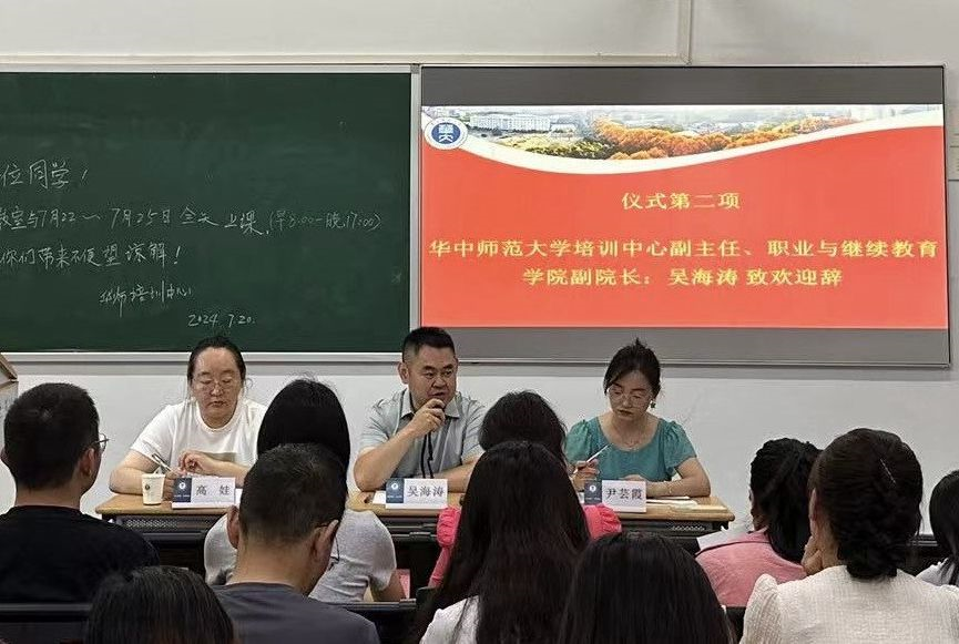 在开班仪式上,吴海涛副主任向此次参训的教师表示热烈欢迎,并介绍了华中师范大学的概况及培训中心的发展。他希望通过本次培训,使参训教师掌握心理健康教育的基本理论、方法和技能,提高心理健康教育的教学水平和指导能力,更新教育观念,树立科学的心理健康教育观,掌握心理健康教育在学生全面发展中的重要作用,将心理健康教育融入日常教育教学工作中。同时他表示会积极协调校内外优质的教育教学资源,为培训班提供高水平的培训师资队伍,努力做好服务工作,为学员提供良好的学习环境。