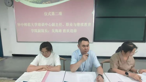 开班仪式在庄严的国歌声中拉开帷幕。华中师范大学培训中心副主任吴海涛出席典礼并讲话。他强调思政教育在当今时代的重要意义,指出思政课是落实立德树人根本任务的重要课程,思政课教师肩负着培养担当民族复兴大任时代新人的崇高使命。