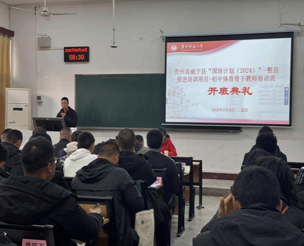 (通讯员:费渊 胡蕾 张敏)2025年3月16日上午,“国培计划(2024)”—— 整县推进培训项目初中体育骨干教师培训班在我校顺利开班。华中师范大学培训中心副主任潘珞琳出席开班典礼并致辞,来自贵州省威宁彝族回族苗族自治县的62位初中体育教师齐聚一堂,共同开启本次研修成长之旅。