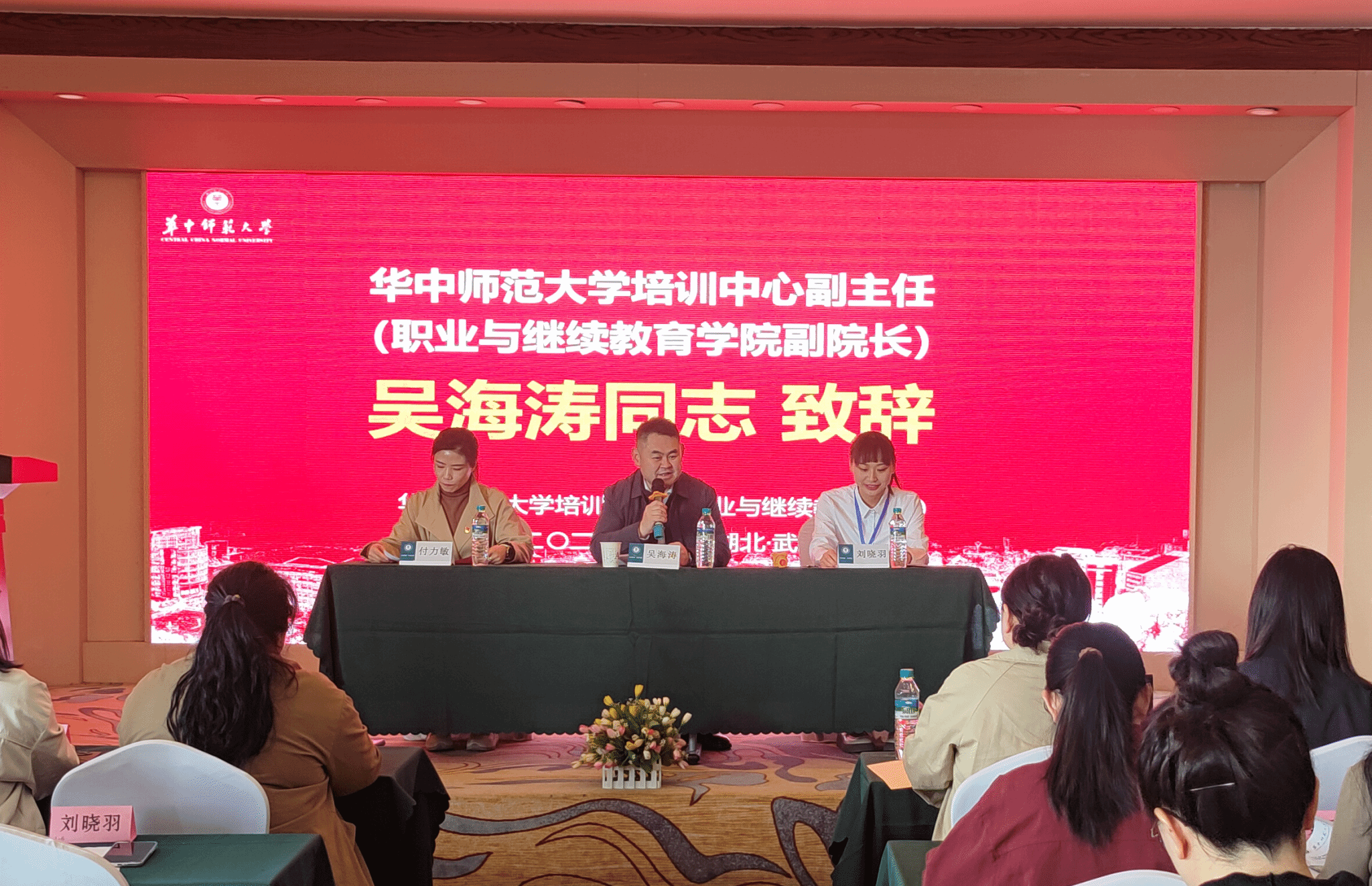 华中师范大学培训中心副主任吴海涛致欢迎辞。在致辞中,他首先向各位学员致以热烈的欢迎。其次,回顾了华中师范大学的发展历程,展现了学校深厚的历史底蕴与教育使命。接着,他深入探讨了学前教育的重要性,强调幼儿教育在幼儿成长和发展中的关键作用。吴海涛副主任希望全体学员珍惜此次难得的学习机会,全身心投入学习,努力成为有理想信念、有道德情操、有扎实学识、有仁爱之心的“四有”好老师,为河北省幼儿教育事业的发展贡献自己的力量。