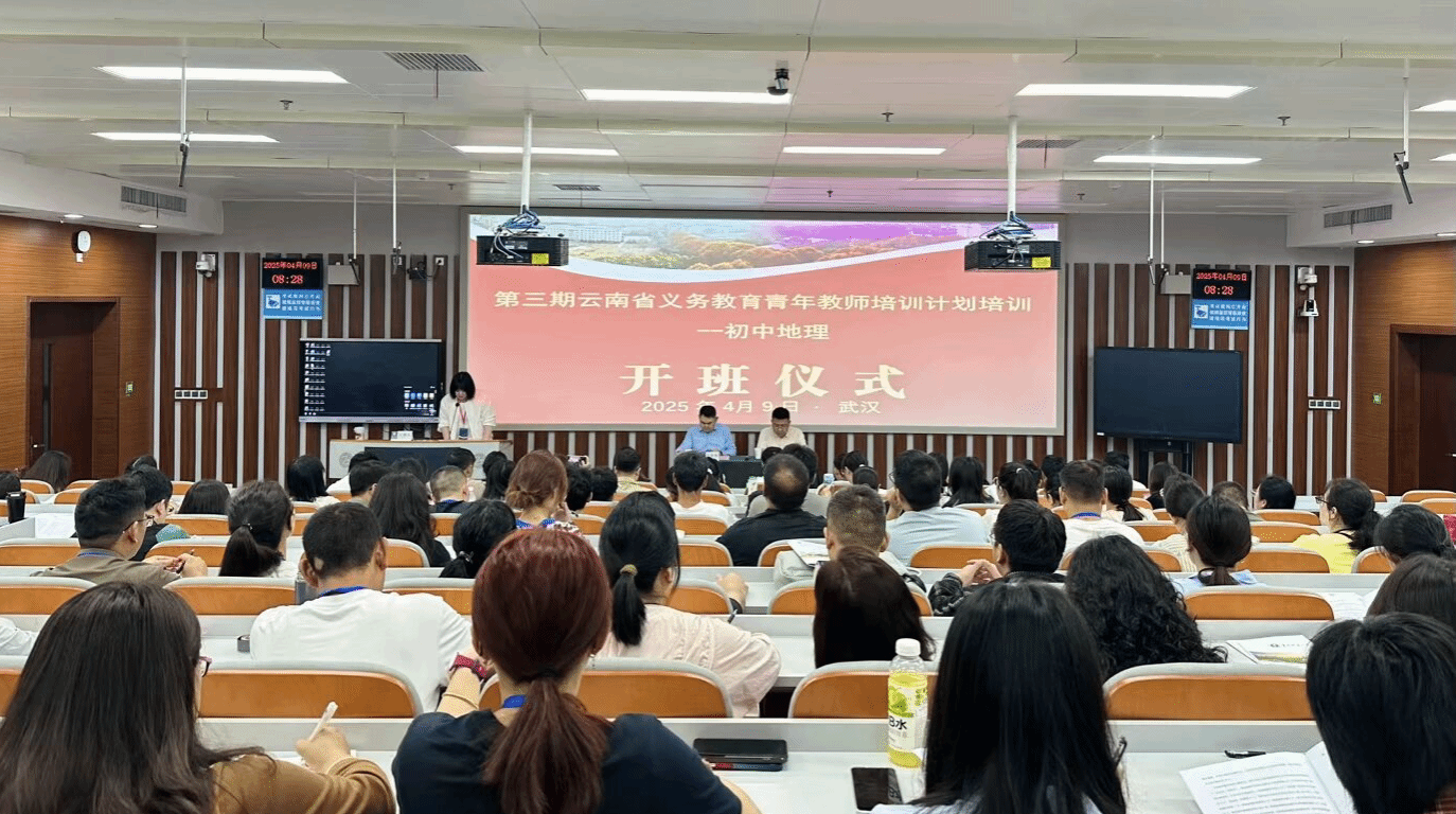 (通讯员:黄旭艳 李军 葛健 王婧)2025年4月9日上午,第三期云南省义务教育青年教师培训计划初中地理培训班开班典礼在华中师范大学南湖校区隆重举行。华中师范大学培训中心副主任吴海涛出席开班典礼并致辞,来自云南省各地的100位初中地理青年骨干教师齐聚一堂,共同开启为期42天的专业研修之旅。开班典礼由班主任王婧老师主持。