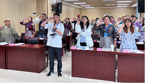 在学习委员、西藏当雄县公塘乡中心小学的扎西达瓦老师的带领下,全体学员进行了庄严的宣誓。学员们右手握拳,高举至耳边,齐声高呼誓言:“国运所系,使命所托,我是一名光荣的人民教师。我深知自身的责任与使命,在此庄严宣誓:忠于党的教育事业,贯彻国家教育方针……为西藏自治区教育事业的发展,为国家和社会教育事业的进步,贡献全部力量!”宣誓之时,他们声音嘹亮,字字如鼓,敲响在每个人的心间,彰显出对教育事业的赤诚热爱与执着追求。
