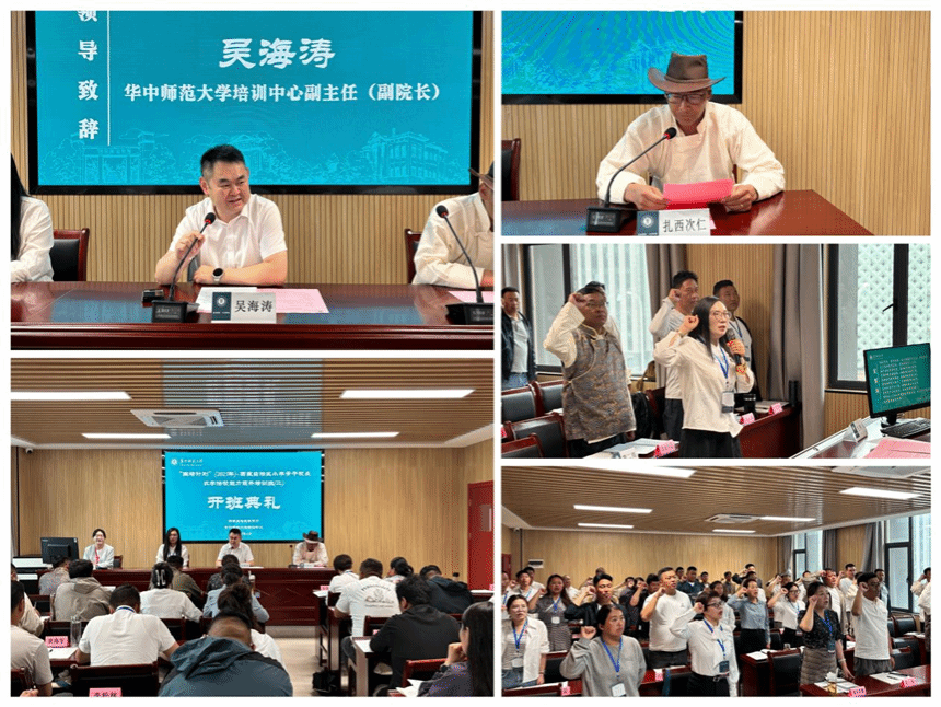 典礼伊始,吴海涛副主任致欢迎辞。他指出,华中师范大学作为国家"双一流"建设高校,始终以服务民族教育为己任。本次培训精心设计了涵盖办学理念创新、学校管理优化、教师专业发展、校园文化建设、教育信息化应用五大模块的课程体系,并邀请全国知名教育专家和优秀一线校长组成授课团队,通过专题讲座、案例分析、互动研讨、名校考察等多种形式,全方位提升校长的办学治校能力。吴副主任对学员提出几点期望:一是提高政治站位,筑牢育人初心;二是坚持知行合一,探索西藏教育发展路径;三是发挥"种子校长"作用,带动区域教育水平提升。他强调,全体学员严格贯彻落实中央八项规定精神,保持优良学风,将培训成果转化为推动西藏教育现代化的实际成效。最后,他预祝培训班获得圆满成功,祝愿全体学员学有所获、满载而归。