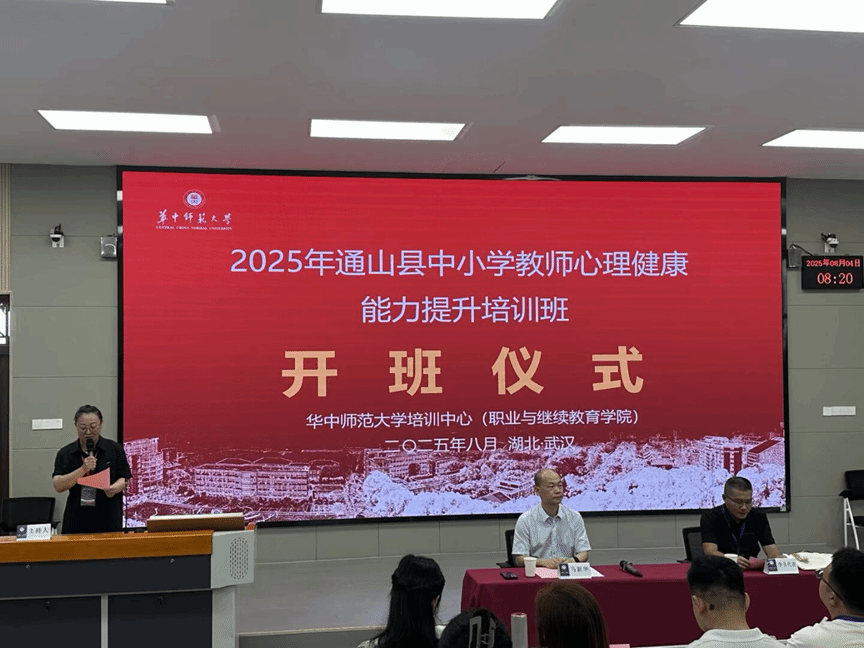 (通讯员:杨文丽 林建 徐冲 许树敏 杨玲 许欣)八月既至,流火烁金;师者初心,如炬长燃。2025年8月4日上午,2025年通山县中小学教师心理健康能力提升培训班开班仪式在华中师范大学隆重举行。华中师范大学培训中心主任马新华出席仪式并致辞,班主任杨玲主持仪式。通山县的96名中小学心理健康骨干教师齐聚一堂,共同开启为期4天的“心育赋能”研修之旅。