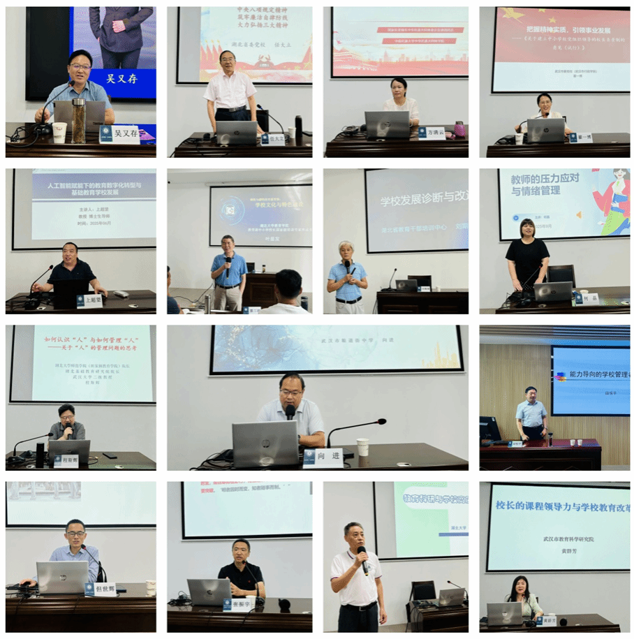 此外,上超望老师剖析《教育数字化转型与基础教育学校发展》,指导校长们制定学校数字化发展规划;叶显发老师从多维度讲解《学校文化与特色构建》,助力打造具有辨识度的学校文化品牌;刘期锡老师聚焦《学校发展与诊断改进》,帮助校长们掌握科学管理工具;何晶老师以体验式培训开展《教师心理健康维护与压力管理》,指导建立教师心理支持体系;向进老师围绕《用制度盘活人力资源》,指导构建科学教师管理体系;程斯辉老师从管理学与心理学视角剖析《如何认识“人”与如何管理“人”》,倡导“以人为本”的管理理念;田恒平老师明确校长核心素养要求,提供《能力导向的学校管理者素养培育》路径;但世辉老师讲解《四层驱动,打造学校高质量教研体系》,助力构建高效教研机制;张振宇老师通过案例复盘《危机与决策:教育领域突发事件与舆情应对》,提升校长应急决策能力;徐学俊老师以《教育科研与学校高质量发展》为主题,结合多所学校以科研促发展的成功案例,系统讲解教育科研课题选题、申报、实施与成果转化的全流程,强调教育科研是破解学校发展难题、提升办学质量的核心动力,指导校长们建立学校科研管理制度;黄群芳老师围绕《校长的课程领导力与学校课程改革》,助力构建特色课程体系,落实立德树人根本任务。