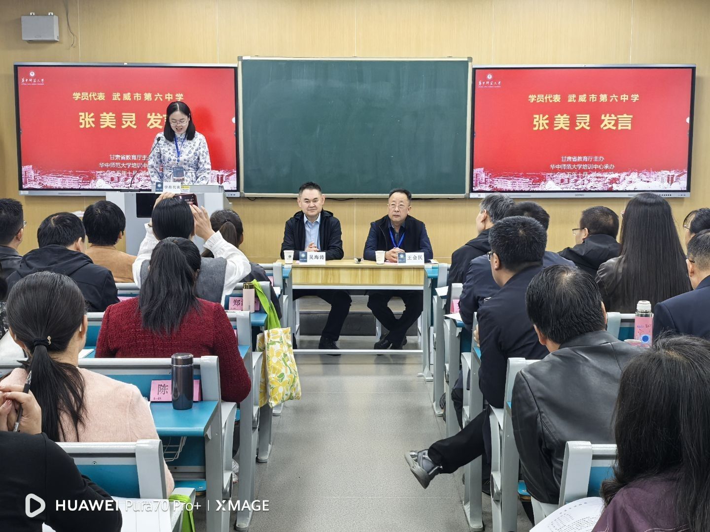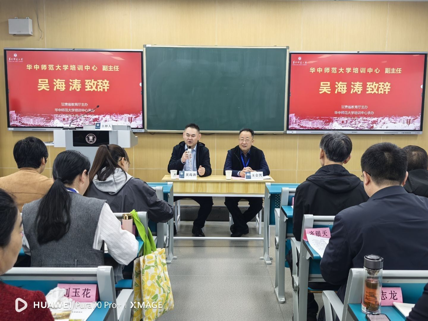 开班仪式在庄严雄壮的国歌声中拉开帷幕。华中师范大学培训中心副主任吴海涛在致辞中,将此次研修定位为一次“从优秀到卓越的淬炼”。他指出,作为教师培训的“播火者”与“引路人”,参训专家不仅要自身业务精湛,更要具备将先进教育理念转化为可复制、可推广培训方案的能力。本次研修课程体系经过精心打磨,将打破传统讲授模式,通过“理论浸润+案例诊断+培训方案设计+数字化素养提升”的四维联动模式,旨在实现学员从“经验输出”到“体系构建”的能力跃迁。他呼吁学员们提升思想站位,加强交流互鉴,将理论与武威教育实际深度结合,为推动武威市教师培训工作提质增效贡献智慧与力量。