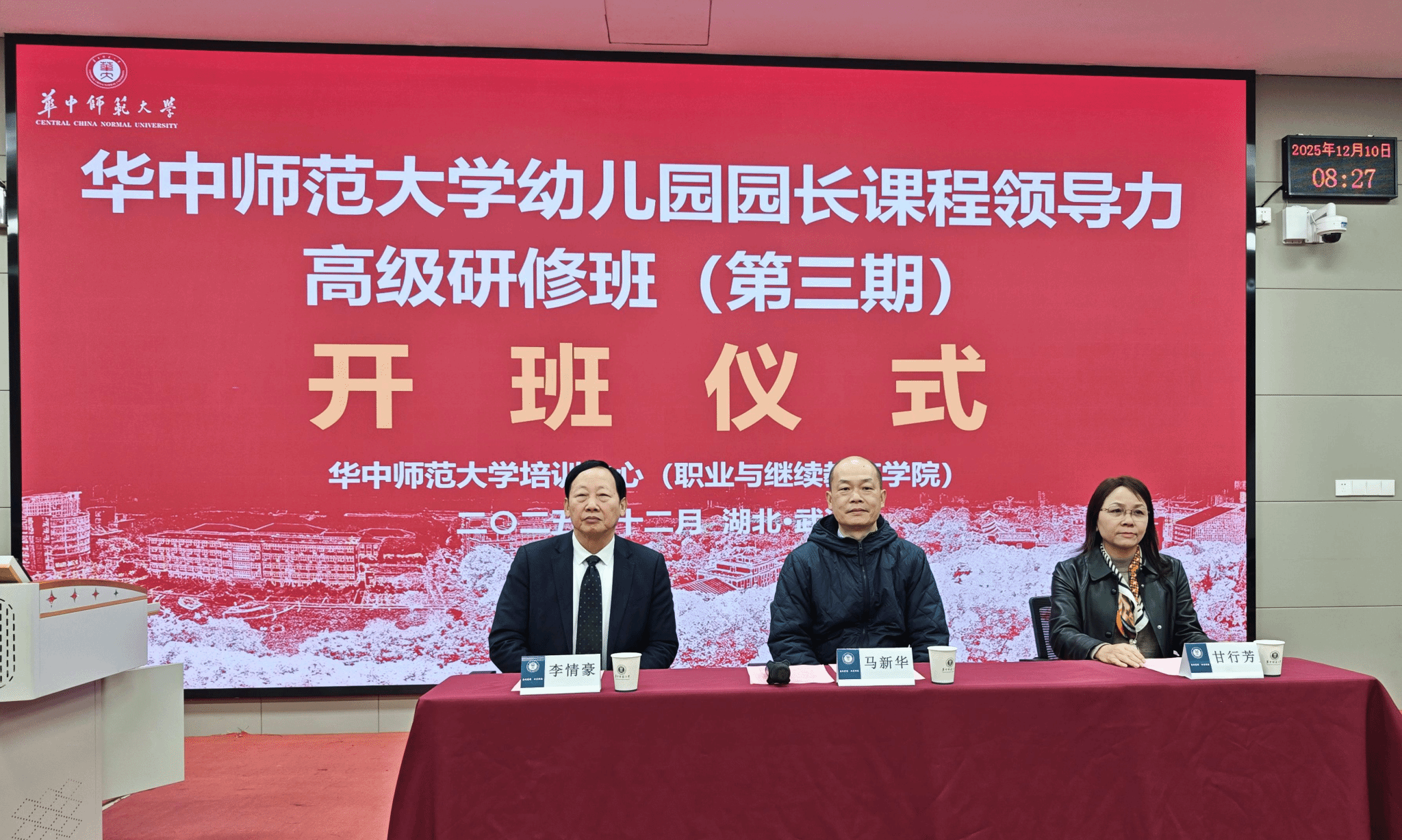 (通讯员:陈文静 张文庆 谢磊 朱爱华)为深入贯彻落实《中华人民共和国学前教育法》及《“十四五”学前教育发展提升行动计划》等国家政策文件精神,持续深化幼儿园课程改革,提升园长的课程领导力,助推学前教育高质量发展,华中师范大学培训中心主办的“幼儿园园长课程领导力高级研修班(第三期)”于2025年12月10日在校内顺利开班。华中师范大学培训中心主任马新华出席并致辞,来自全国各地的80位幼儿园园长、教学园长、保教主任及骨干教师齐聚桂子山,开启为期四天的深度研修之旅。