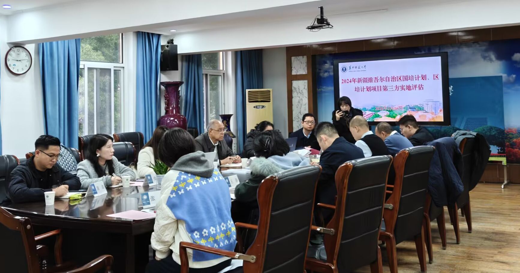 2026年3月16日上午,2024年新疆维吾尔自治区“国培计划”“区培计划”项目第三方实地评估工作在华中师范大学培训中心顺利开展。评估专家组孙望安、向辉等一行8人莅临考察指导。华中师范大学培训中心主任马新华、副主任吴海涛,教师培训部部长刘淳、副部长张静、王静,以及项目组核心成员参加了本次评估汇报会。